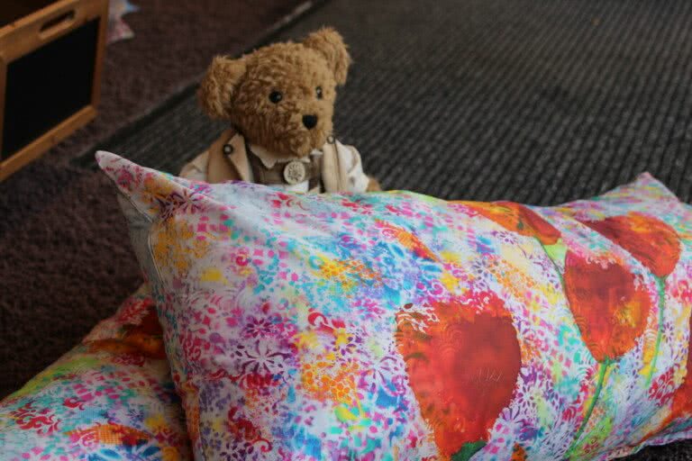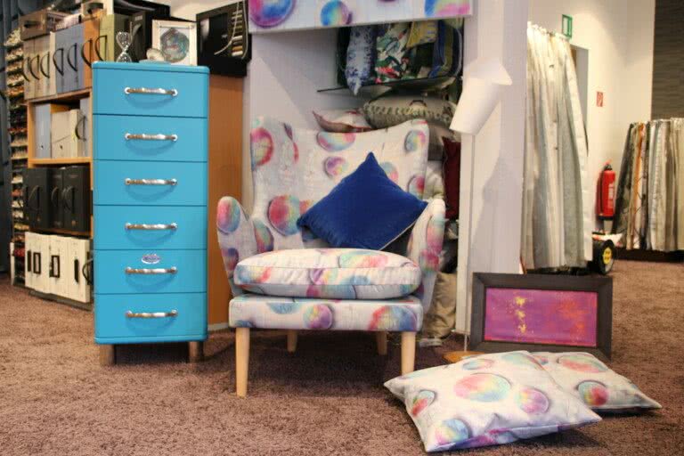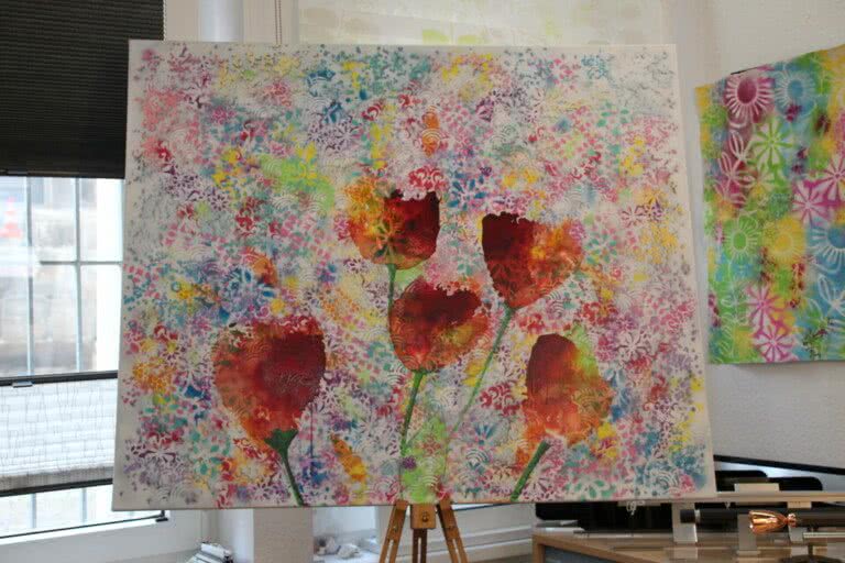 Sabine Oecking wurde auf uns über unsere breit gefächerte Produktauswahl an Storeware, Dekos, Teppichen und Tapeten zunächst als Kundin aufmerksam. Bei unserem Besuch in dem Atelier der Künstlerin in Dortmund-Huckarde wurde dann die Idee geboren: warum nicht die wunderschönen Bildmotive in eine exklusive Gardine, einen originellen Sesselbezug oder eine erlesene Bettwäsche verwandeln?